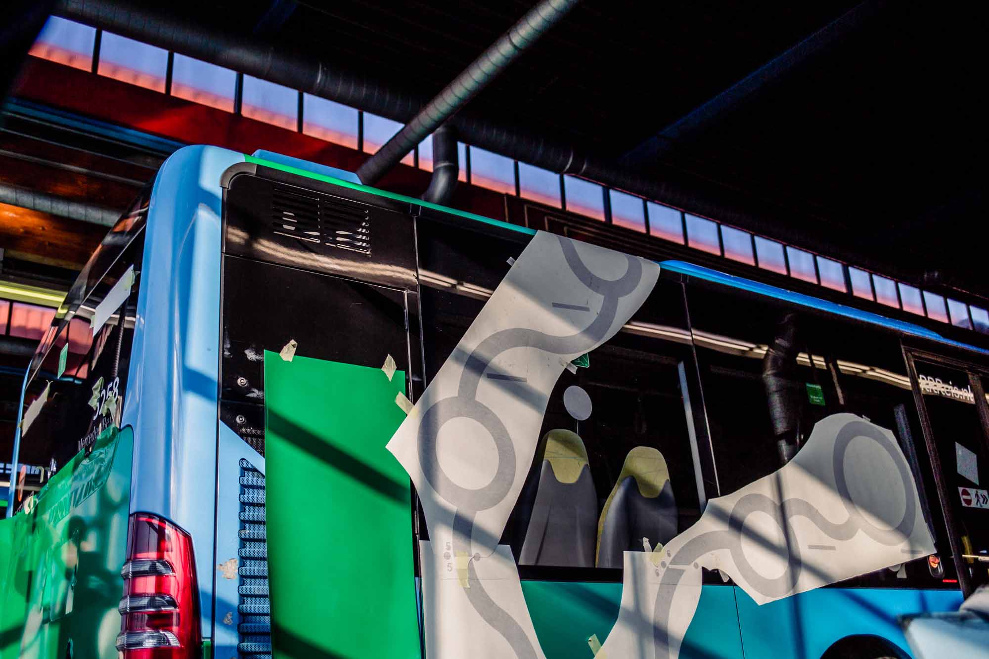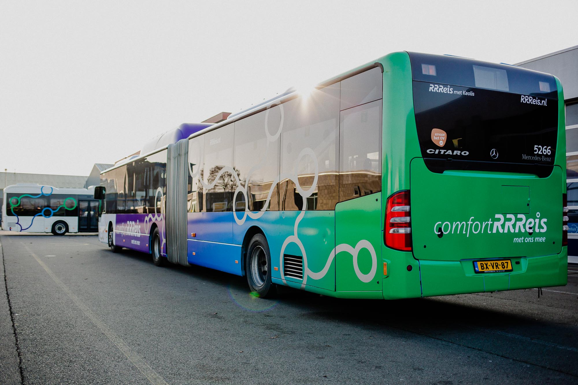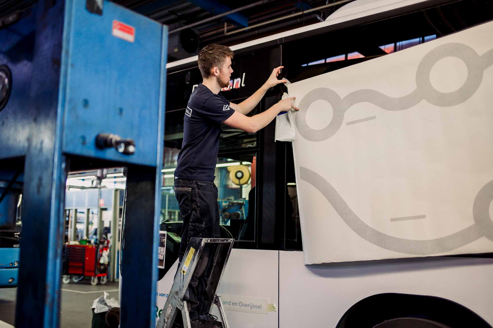 Naast het werk in onze eigen hal verzorgen we ook bestickeringsprojecten door heel Nederland, zoals bij deze klus op locatie. Voor RRReis hebben we op locatie meerdere bussen, waaronder ook elektrische varianten, voorzien van de herkenbare RRReis-huisstijl.