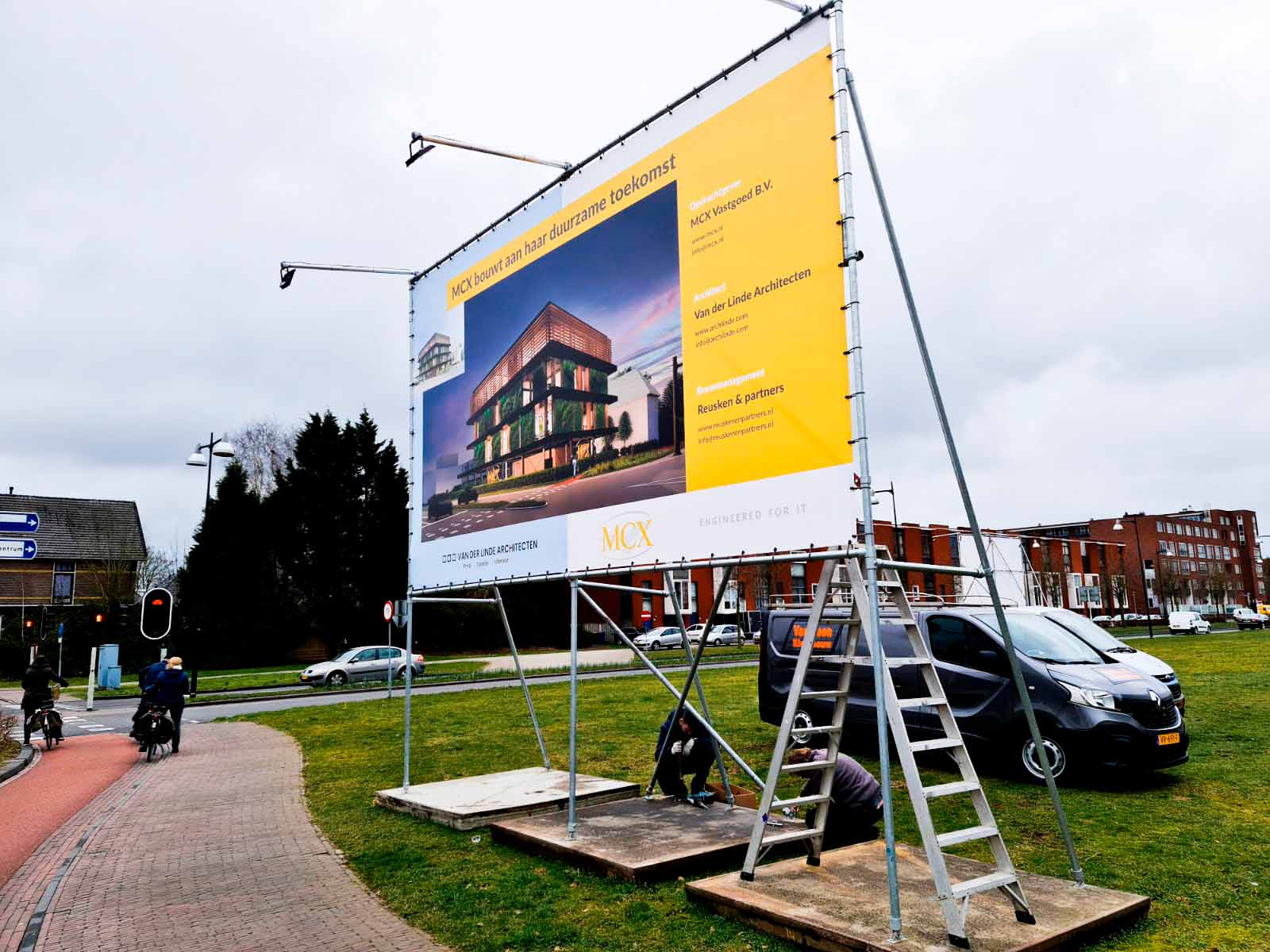 Voor MCX Vastgoed B.V. hebben we op de bouwplaats een spandoek met frame geplaatst. Het doek is voorzien van verlichting met ledspots, waardoor de boodschap zowel overdag als in de avond goed zichtbaar is.