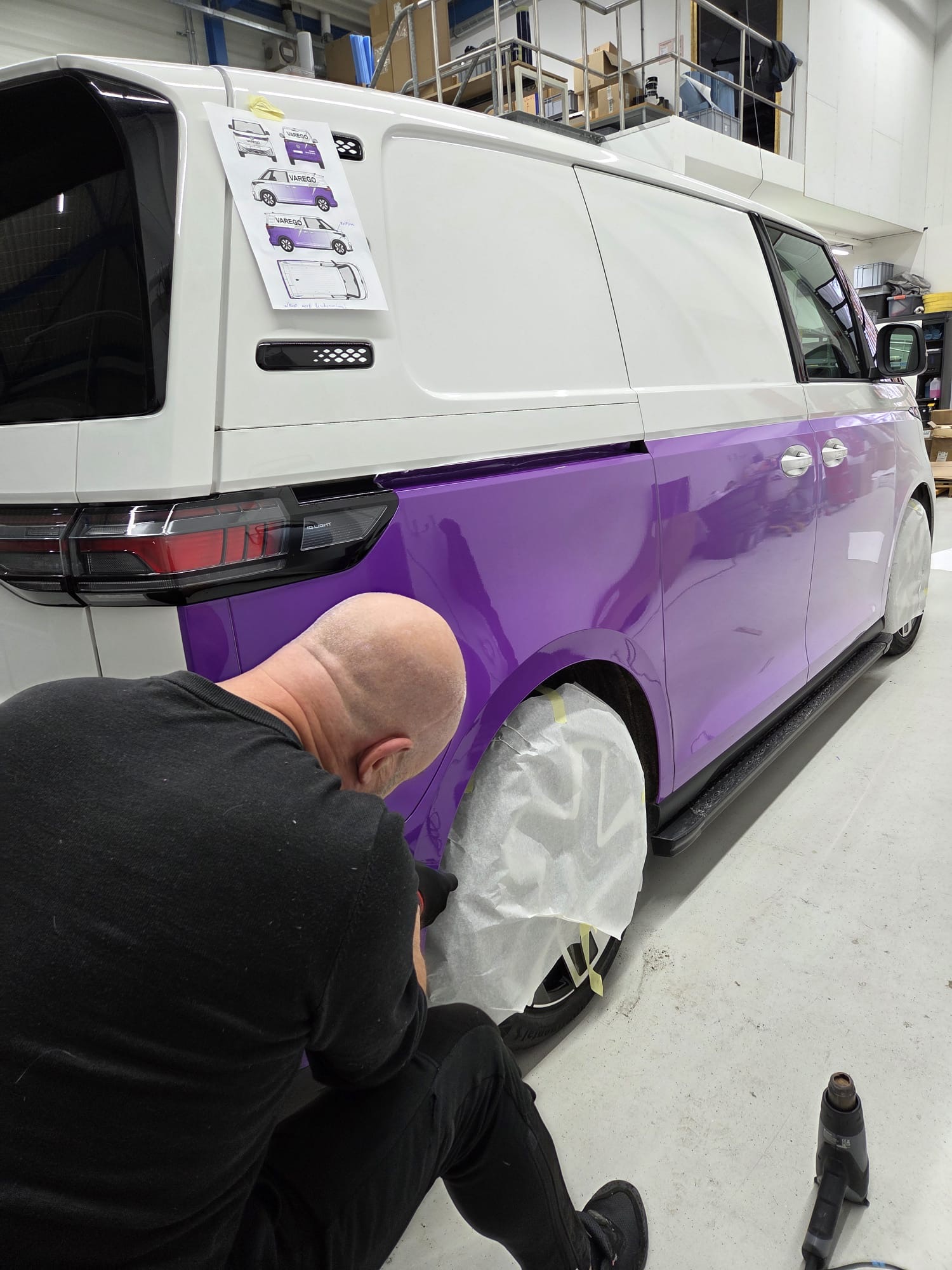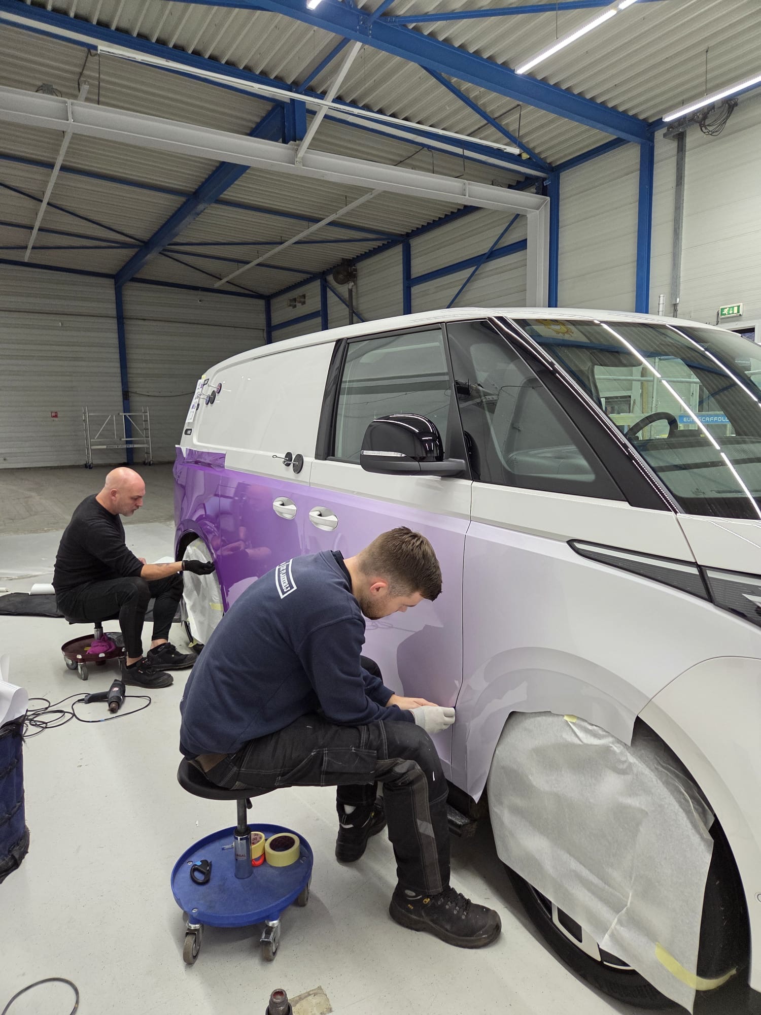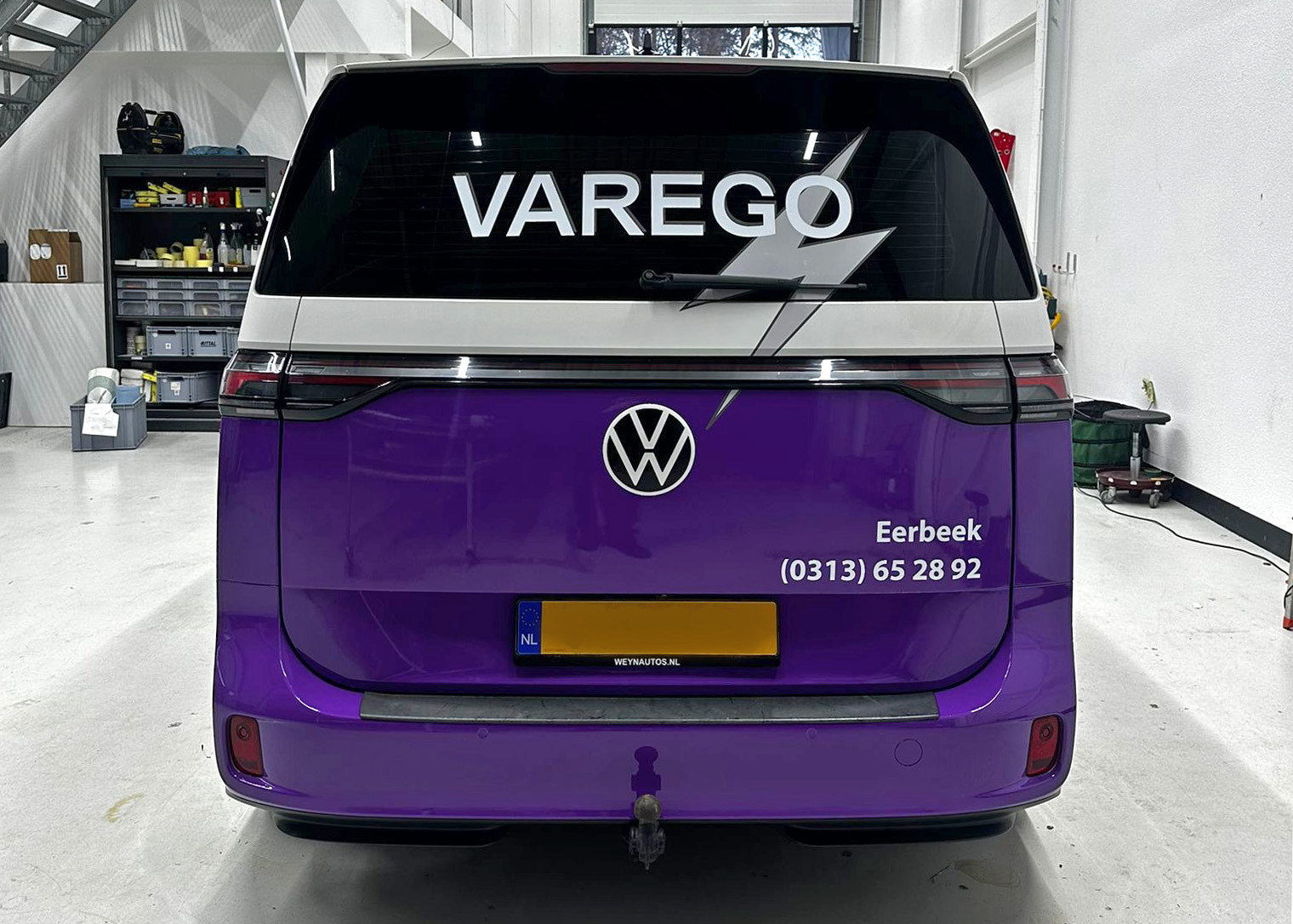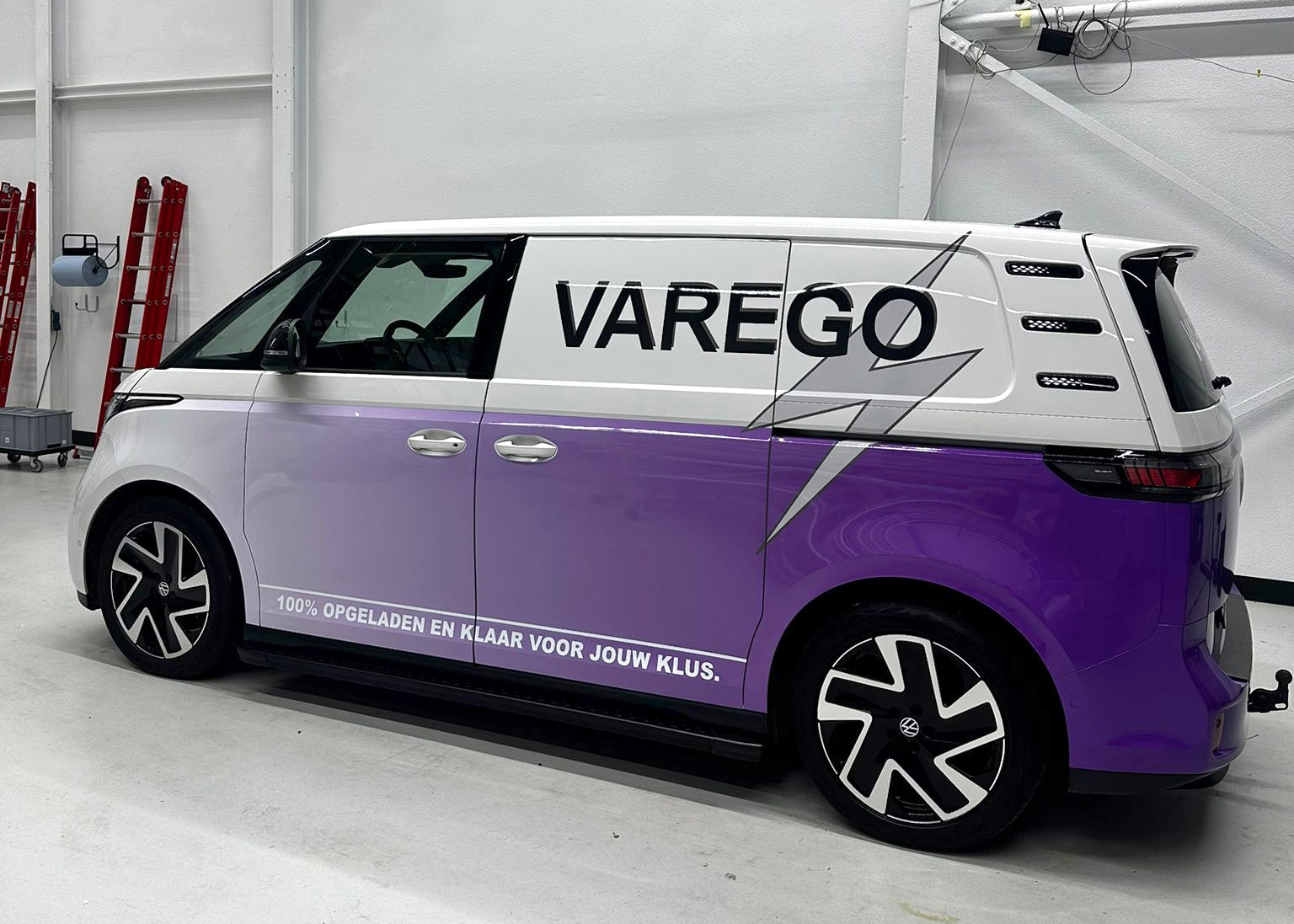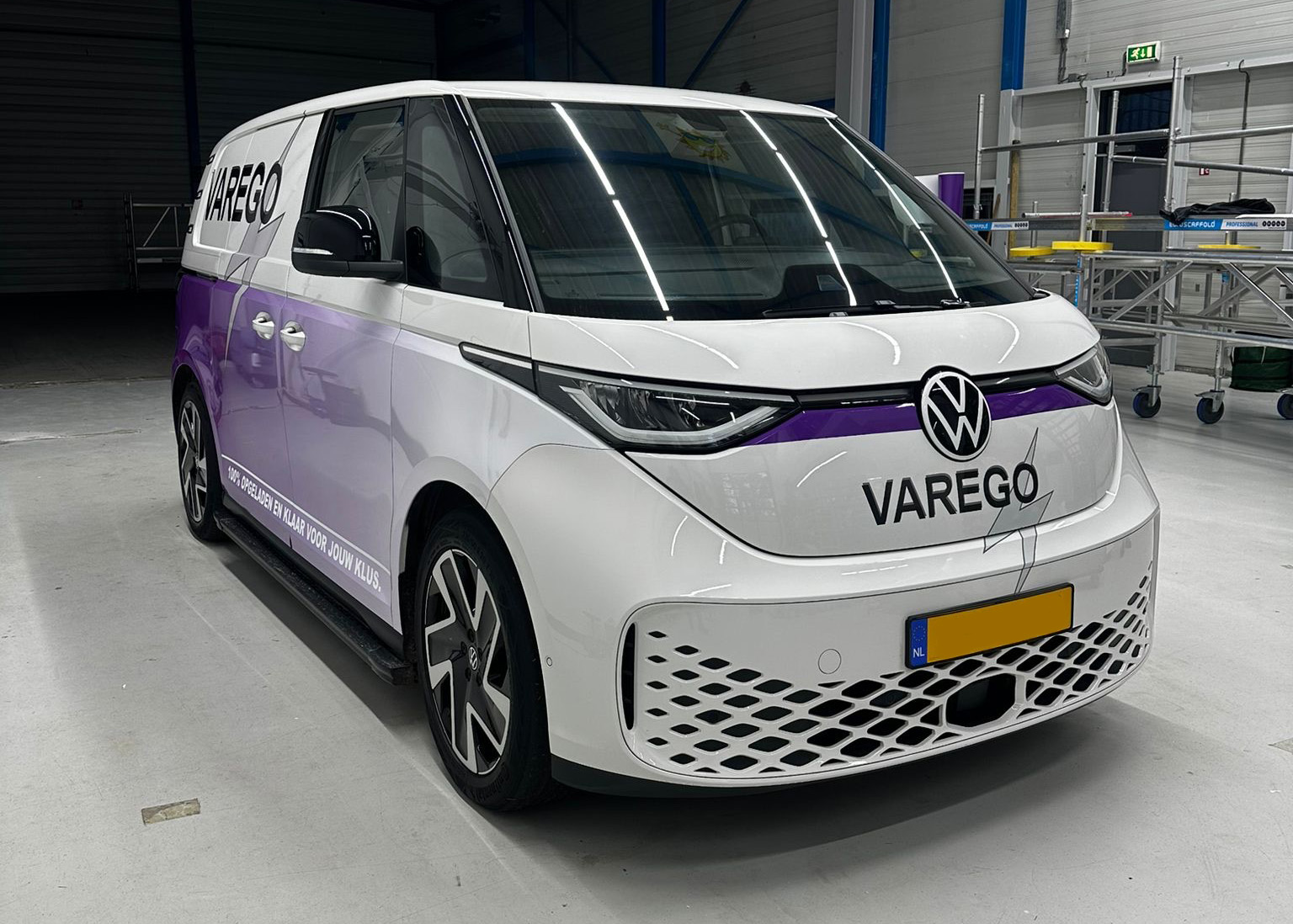 Voor Varego hebben wij deze nieuwe Volkswagen ID Buzz voorzien van een strakke bestickering in de huisstijl. De elektrische bus heeft zo een moderne en herkenbare uitstraling gekregen die perfect past bij het bedrijf.